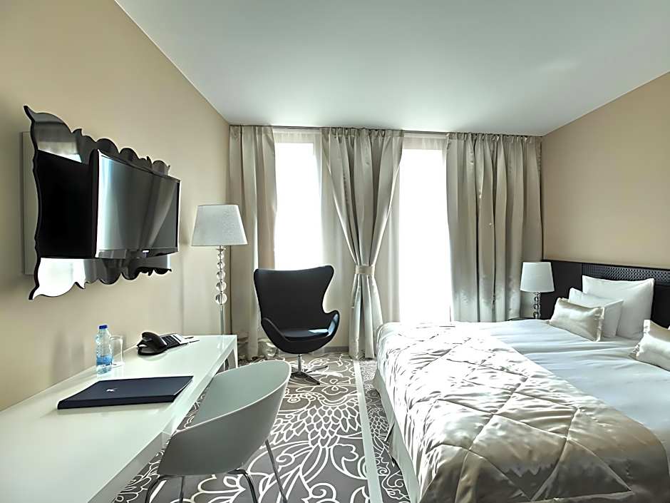 Stylishly decorated room with a large LCD TV on the wall. The room is facing the street. Access to Spa and Fitness area is included in the room rate.